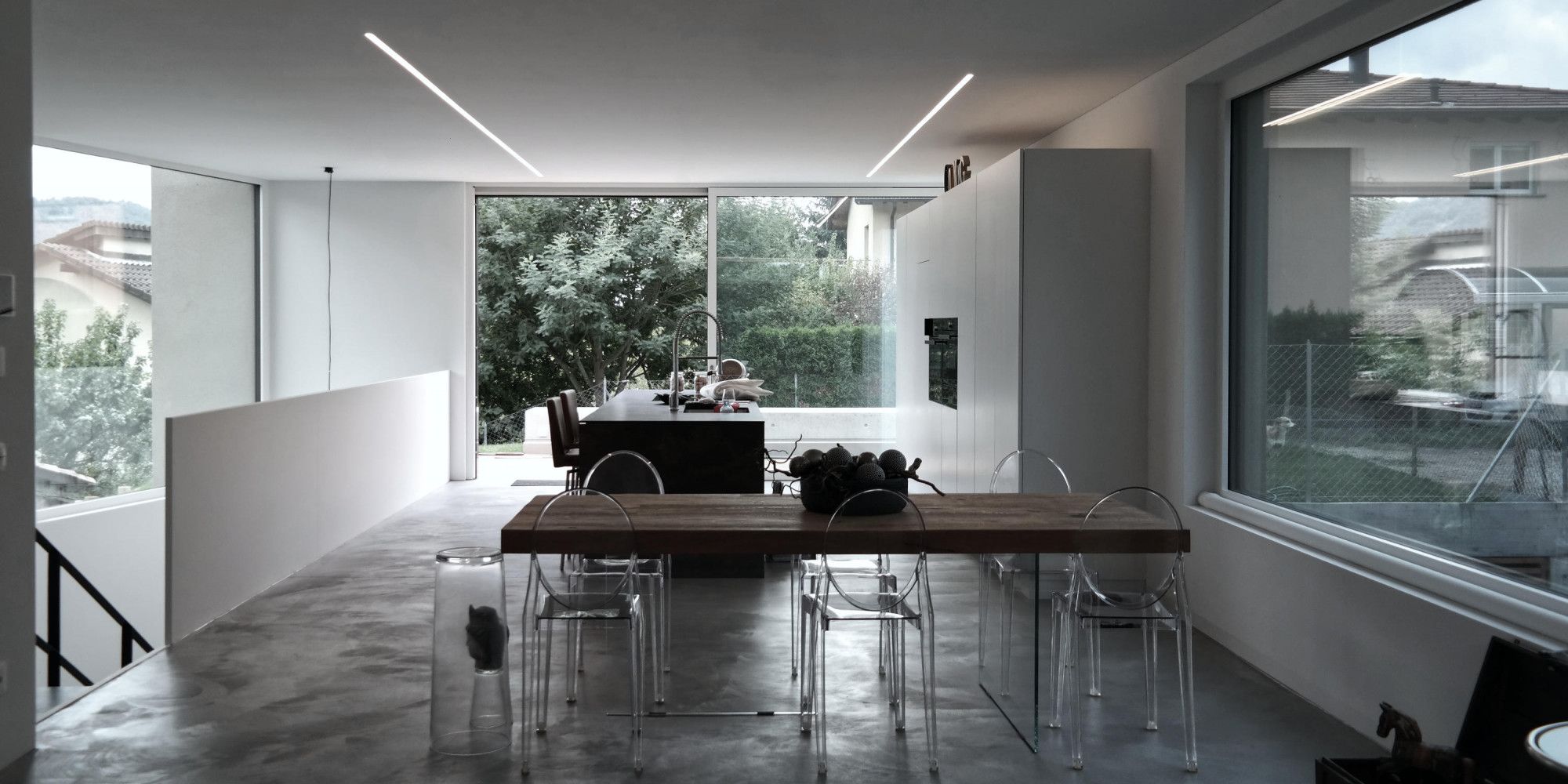 L’inserimento nel terreno è stato studiato al fine di ovviare a dei problemi legati ai potenziali rumori di una strada molto trafficata nelle immediate vicinanze. La decisione di incassare di un piano l’intero volume ha permesso inoltre di creare un accesso agioso, che in aggiunta alla dimensione delle vetrate e l’altezza dei locali ha consentito di avere il giusto equilibrio tra luminosità e privacy, inquadrando le viste sul panorama circostante.