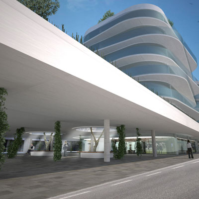 Per meglio integrarsi con il quartiere il piano terreno diventa trasparente, permeabile anche per chi cammina sulla strada. Un giardino pensile aperto al pubblico come una piazza che funge da collegamento al vicino lago, ed un’interessante area di svago sulla quale si affacciano negozi e piccole boutique.