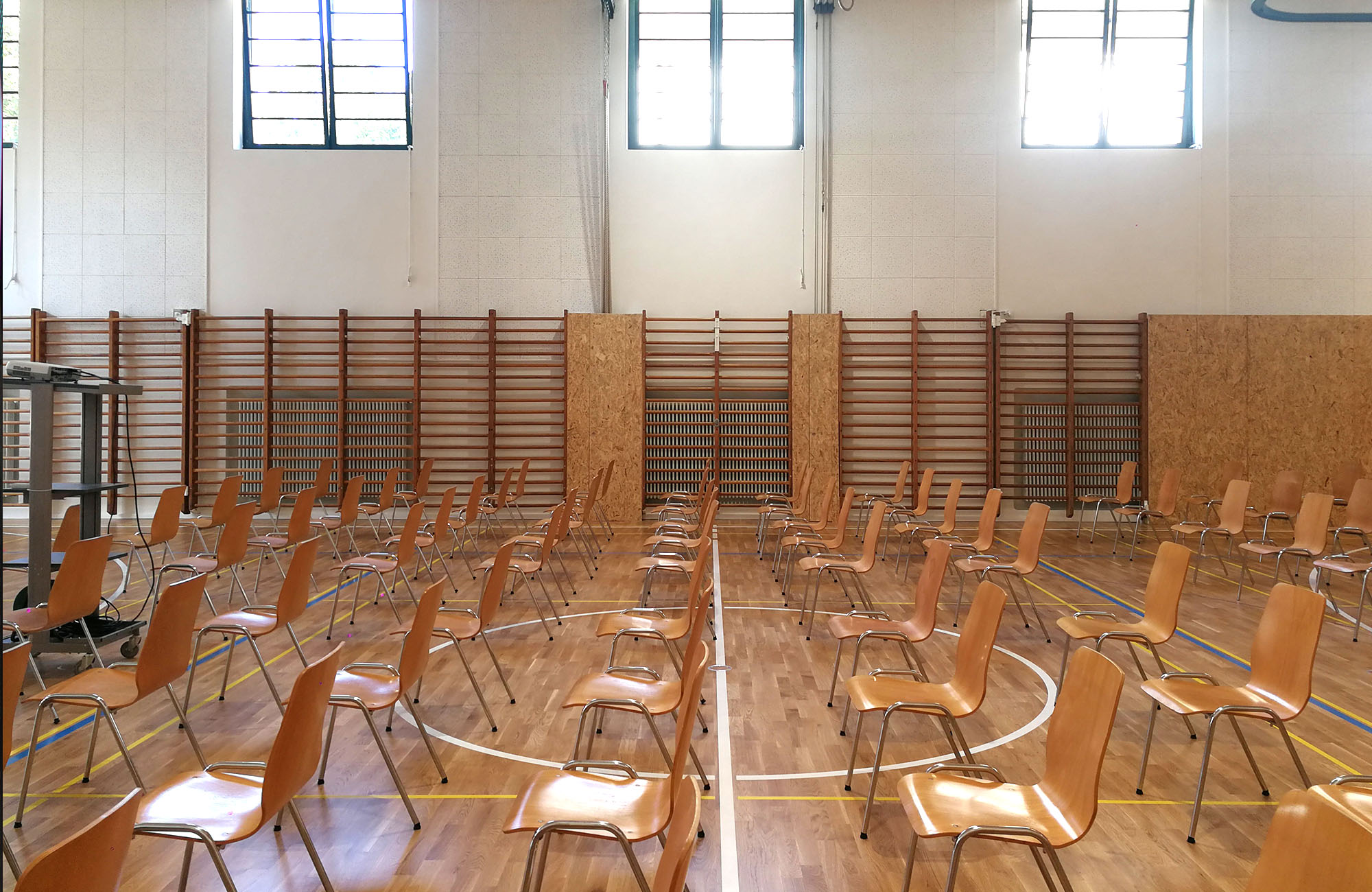 Il progetto consiste nel restyling della palestra del Liceo 1 a Lugano con un linguaggio contemporaneo ma nel rispetto della sua categoria di edificio protetto. Il vecchio pavimento sintetico è stato sostituito da un legno apposito per attività sportive. Un nuovo controsoffitto ha permesso di integrare altoparlanti, illuminazione a LED e nascondere parzialmente l'impiantistica. Le pareti sono state rivestite in OSB integrando illuminazione e attrezzistica. È stato eseguito uno studio illuminotecnico per dotare lo spazio di una illuminazione idonea alle attività scolastiche che si svolgono all'interno della palestra. La riqualifica della palestra ha interessato anche gli spogliatoi: le superfici in piastrelle esistenti e rovinate dall'usura sono state sostituite da un rivestimento in resina moderno e resistente.